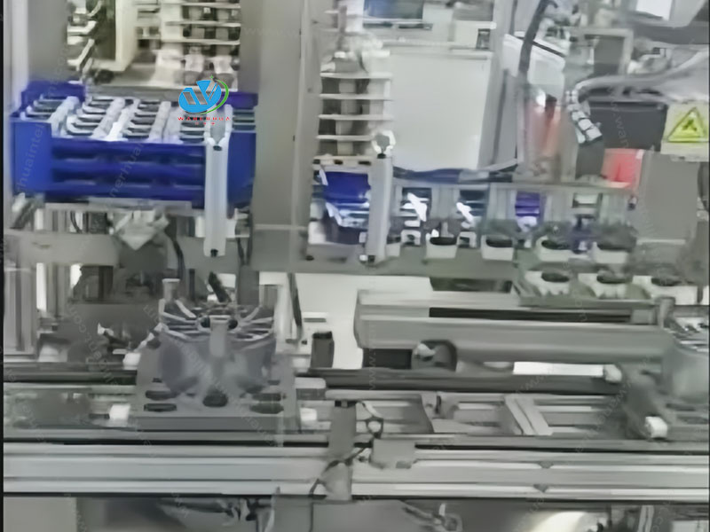 This production line successively completes the assembly of all parts of relay including coil, iron core, yoke, moving spring, base plate, resistance, terminal, stop piece, shell and other parts, and carries out the inspection of all electrical parameters of the assembled products, selects the defective products found in the assembly and inspection process, and finally outputs the qualified finished products. This production line realizes the full automatic production of relay, reduces the labor cost and improves the production efficiency.